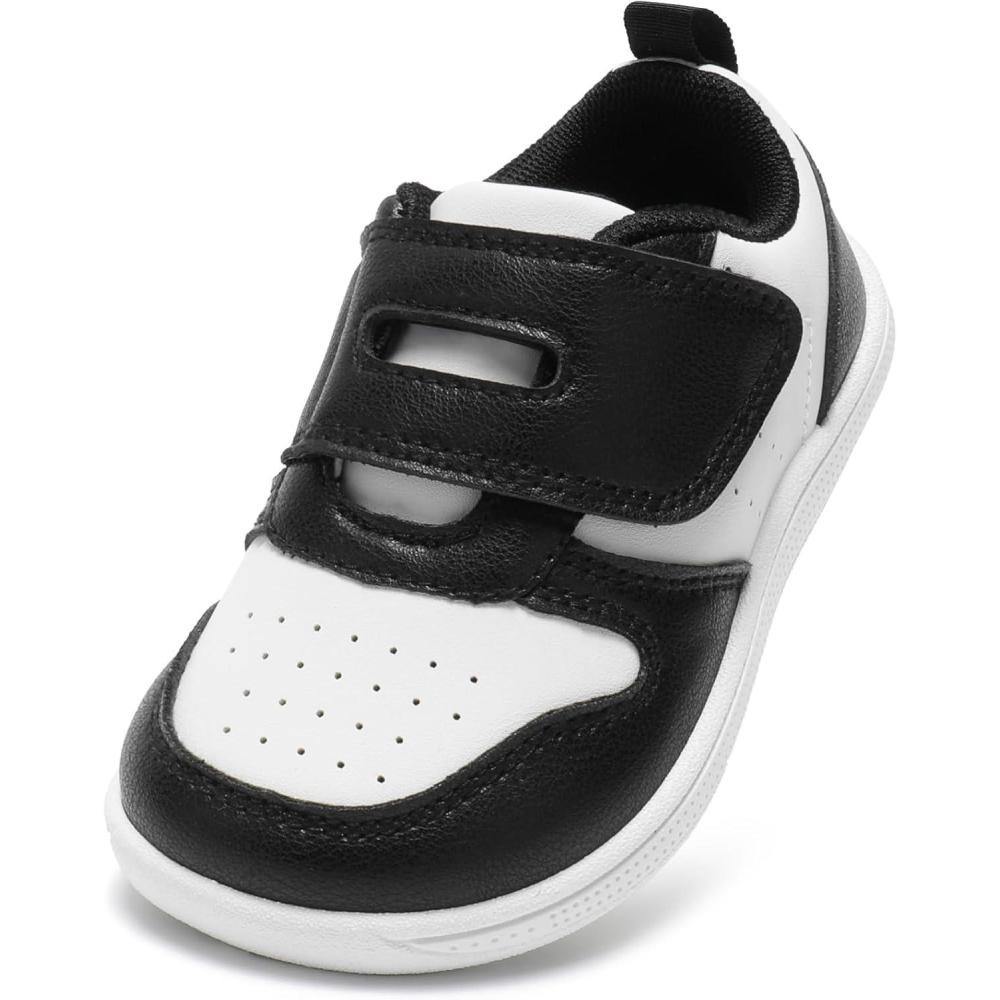 Toddler Wide Toe Box Barefoot Shoes Boys Girls Sneakers Zero Drop Kid Tennis Running Shoes Lightweight Non-Slip Comfortable Leather First Walking Shoe Outdoor Activities School(Black White)